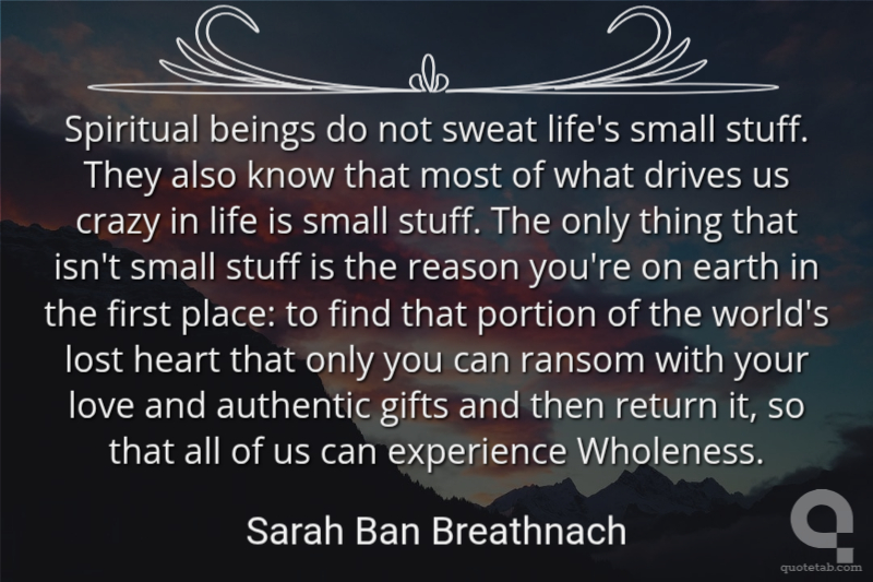 Spiritual beings do not sweat life's small stuff. They also know that most of what drives us crazy in life is small stuff. The only thing that isn't small stuff is the reason you're on earth in the first place: to find that portion of the world's lost heart that only you can ransom with your love and authentic gifts and then return it, so that all of us can experience Wholeness.