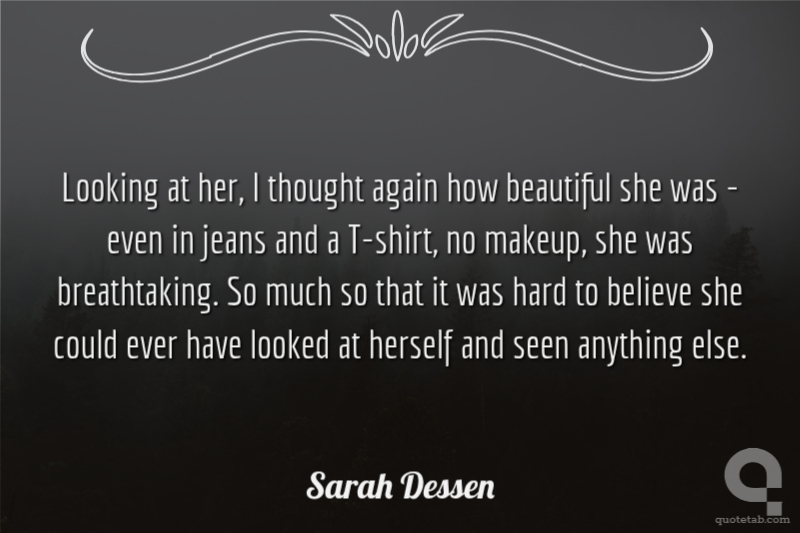 Looking at her, I thought again how beautiful she was - even in jeans and a T-shirt, no makeup, she was breathtaking. So much so that it was hard to believe she could ever have looked at herself and seen anything else.
