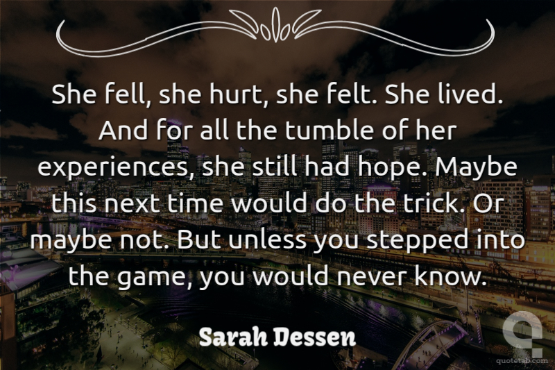 She fell, she hurt, she felt. She lived. And for all the tumble of her experiences, she still had hope. Maybe this next time would do the trick. Or maybe not. But unless you stepped into the game, you would never know.