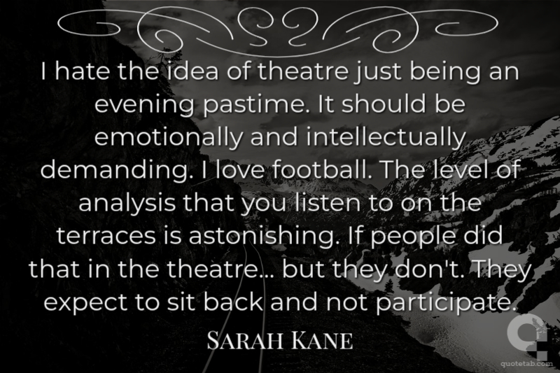 I hate the idea of theatre just being an evening pastime. It should be emotionally and intellectually demanding. I love football. The level of analysis that you listen to on the terraces is astonishing. If people did that in the theatre... but they don't. They expect to sit back and not participate.