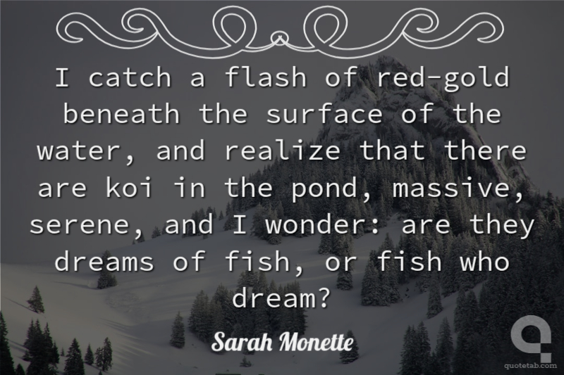 I catch a flash of red-gold beneath the surface of the water, and realize that there are koi in the pond, massive, serene, and I wonder: are they dreams of fish, or fish who dream?