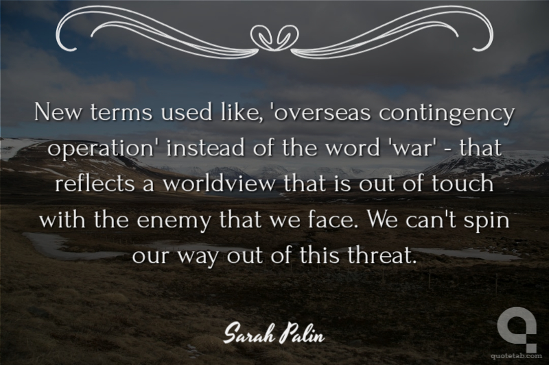 New terms used like, 'overseas contingency operation' instead of the word 'war' - that reflects a worldview that is out of touch with the enemy that we face. We can't spin our way out of this threat.