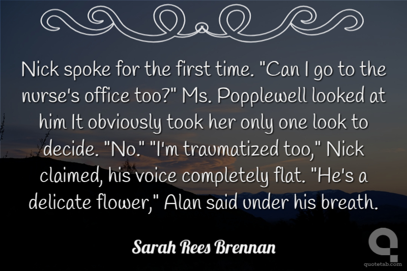 Nick spoke for the first time. "Can I go to the nurse's office too?" Ms. Popplewell looked at him It obviously took her only one look to decide. "No." "I'm traumatized too," Nick claimed, his voice completely flat. "He's a delicate flower," Alan said under his breath.