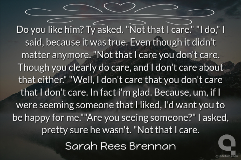 Do you like him? Ty asked. "Not that I care." "I do," I said, because it was true. Even though it didn't matter anymore. "Not that I care you don't care. Though you clearly do care, and I don't care about that either." "Well, I don't care that you don't care that I don't care. In fact i'm glad. Because, um, if I were seeming someone that I liked, I'd want you to be happy for me.""Are you seeing someone?" I asked, pretty sure he wasn't. "Not that I care.