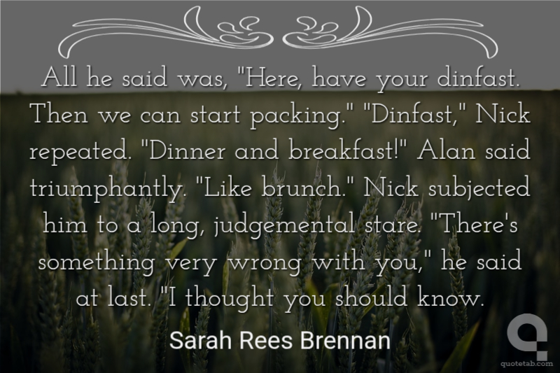 All he said was, "Here, have your dinfast. Then we can start packing." "Dinfast," Nick repeated. "Dinner and breakfast!" Alan said triumphantly. "Like brunch." Nick subjected him to a long, judgemental stare. "There's something very wrong with you," he said at last. "I thought you should know.