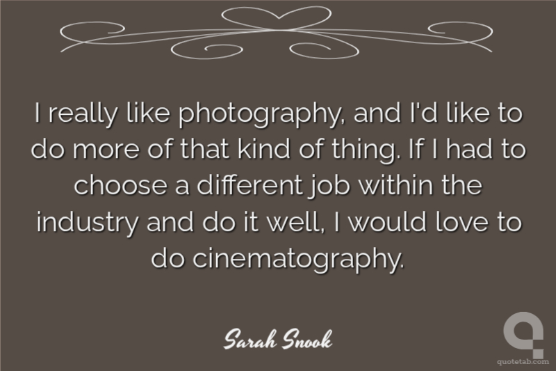 I really like photography, and I'd like to do more of that kind of thing. If I had to choose a different job within the industry and do it well, I would love to do cinematography.