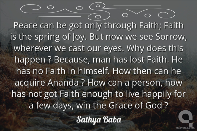 Peace can be got only through Faith; Faith is the spring of Joy. But now we see Sorrow, wherever we cast our eyes. Why does this happen ? Because, man has lost Faith. He has no Faith in himself. How then can he acquire Ananda ? How can a person, how has not got Faith enough to live happily for a few days, win the Grace of God ?