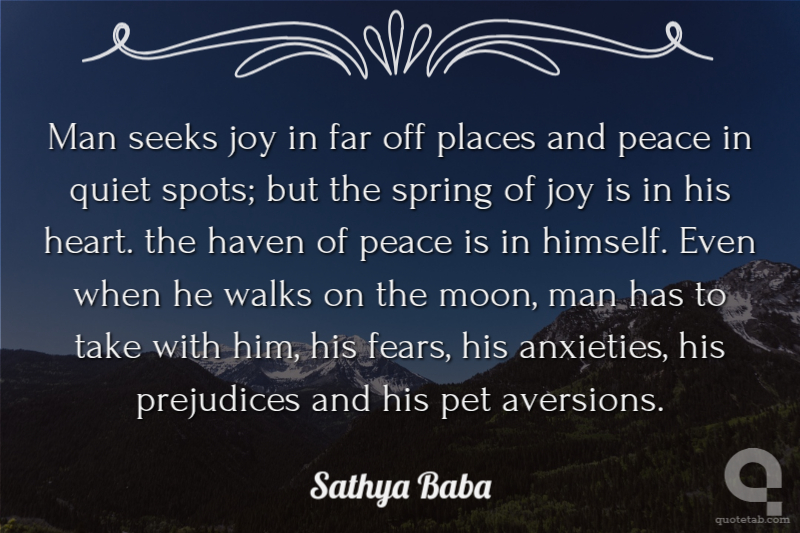 Man seeks joy in far off places and peace in quiet spots; but the spring of joy is in his heart. the haven of peace is in himself. Even when he walks on the moon, man has to take with him, his fears, his anxieties, his prejudices and his pet aversions.