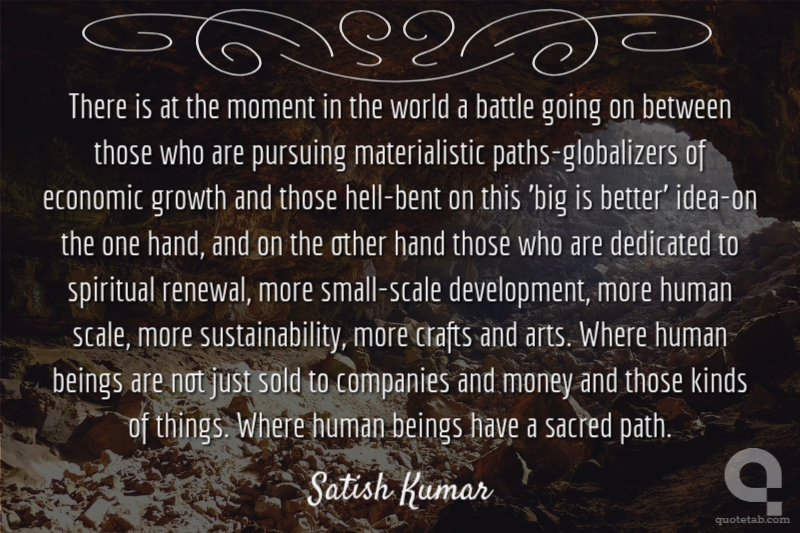 There is at the moment in the world a battle going on between those who are pursuing materialistic paths-globalizers of economic growth and those hell-bent on this 'big is better' idea-on the one hand, and on the other hand those who are dedicated to spiritual renewal, more small-scale development, more human scale, more sustainability, more crafts and arts. Where human beings are not just sold to companies and money and those kinds of things. Where human beings have a sacred path.