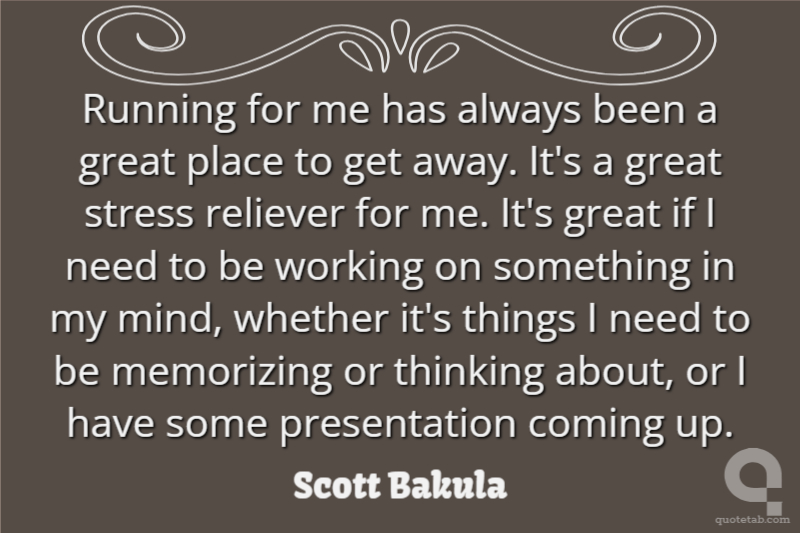 Running for me has always been a great place to get away. It's a great stress reliever for me. It's great if I need to be working on something in my mind, whether it's things I need to be memorizing or thinking about, or I have some presentation coming up.