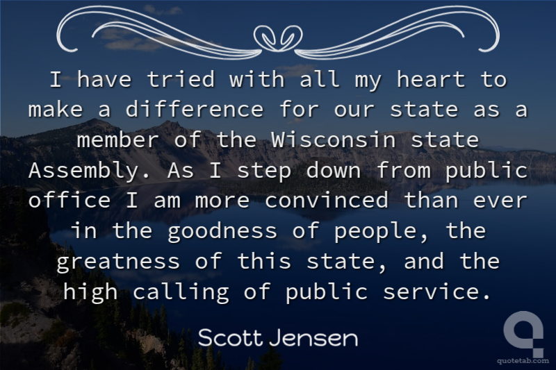 I have tried with all my heart to make a difference for our state as a member of the Wisconsin state Assembly. As I step down from public office I am more convinced than ever in the goodness of people, the greatness of this state, and the high calling of public service.