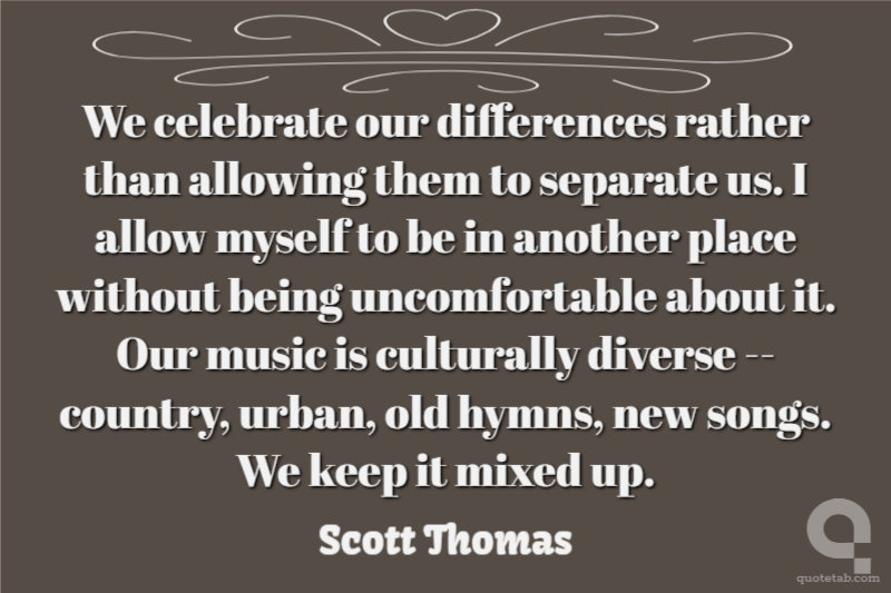 We celebrate our differences rather than allowing them to separate us. I allow myself to be in another place without being uncomfortable about it. Our music is culturally diverse -- country, urban, old hymns, new songs. We keep it mixed up.