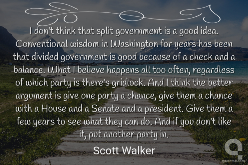 I don't think that split government is a good idea. Conventional wisdom in Washington for years has been that divided government is good because of a check and a balance. What I believe happens all too often, regardless of which party is there's gridlock. And I think the better argument is give one party a chance, give them a chance with a House and a Senate and a president. Give them a few years to see what they can do. And if you don't like it, put another party in.