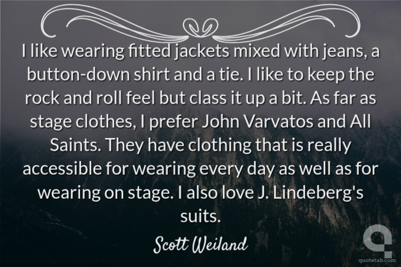 I like wearing fitted jackets mixed with jeans, a button-down shirt and a tie. I like to keep the rock and roll feel but class it up a bit. As far as stage clothes, I prefer John Varvatos and All Saints. They have clothing that is really accessible for wearing every day as well as for wearing on stage. I also love J. Lindeberg's suits.