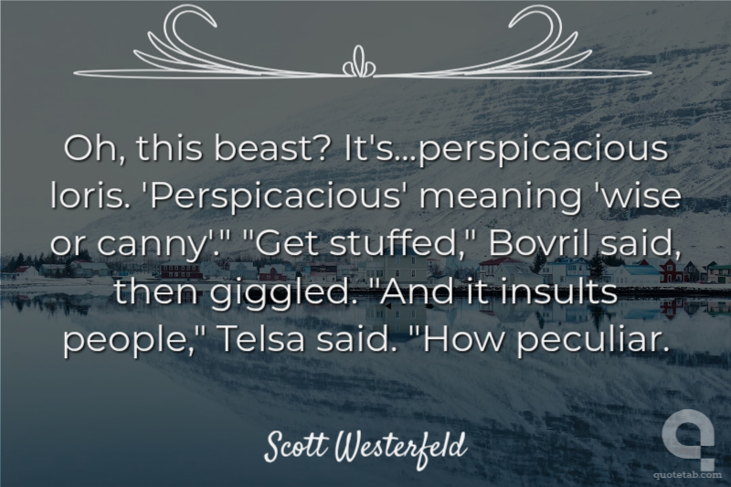 Oh, this beast? It's...perspicacious loris. 'Perspicacious' meaning 'wise or canny'." "Get stuffed," Bovril said, then giggled. "And it insults people," Telsa said. "How peculiar.