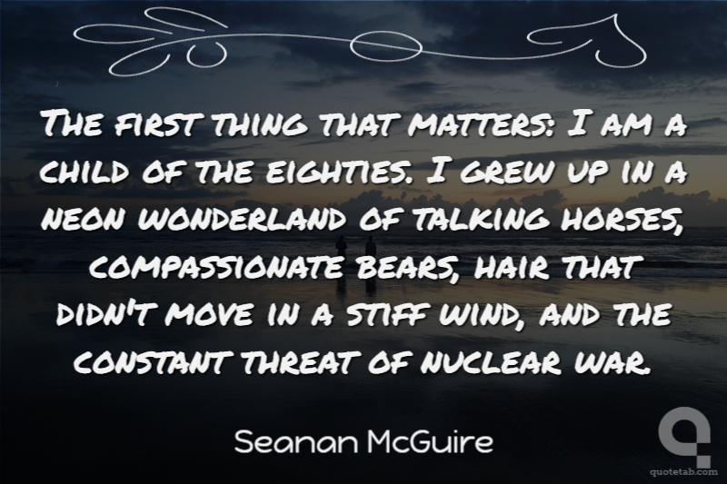 The first thing that matters: I am a child of the eighties. I grew up in a neon wonderland of talking horses, compassionate bears, hair that didn't move in a stiff wind, and the constant threat of nuclear war.