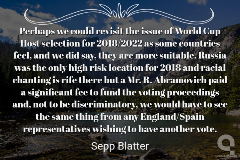 Perhaps we could revisit the issue of World Cup Host selection for 2018/2022 as some countries feel, and we did say, they are more suitable. Russia was the only high risk location for 2018 and racial chanting is rife there but a Mr. R. Abramovich paid a significant fee to fund the voting proceedings and, not to be discriminatory, we would have to see the same thing from any England/Spain representatives wishing to have another vote.