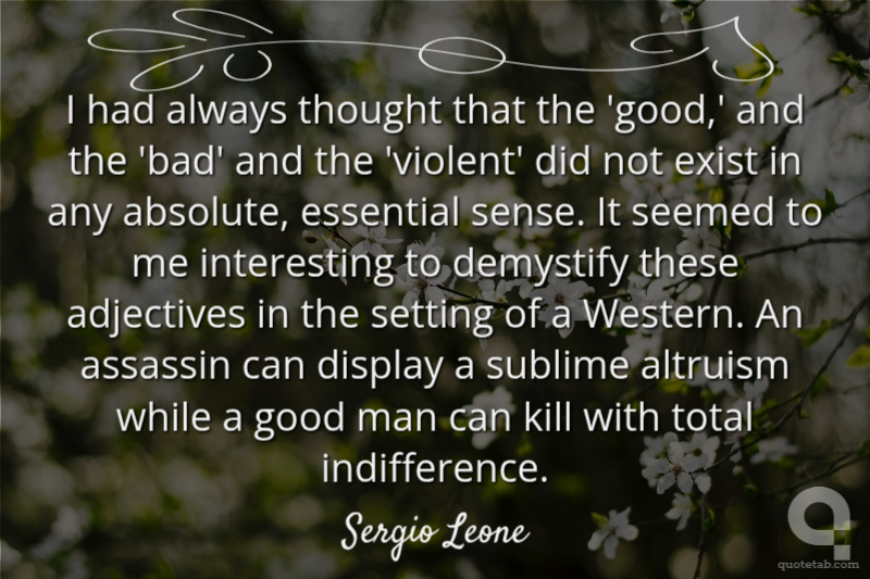 I had always thought that the 'good,' and the 'bad' and the 'violent' did not exist in any absolute, essential sense. It seemed to me interesting to demystify these adjectives in the setting of a Western. An assassin can display a sublime altruism while a good man can kill with total indifference.