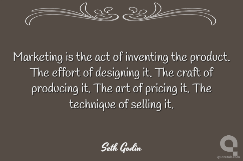 Marketing is the act of inventing the product. The effort of designing it. The craft of producing it. The art of pricing it. The technique of selling it.
