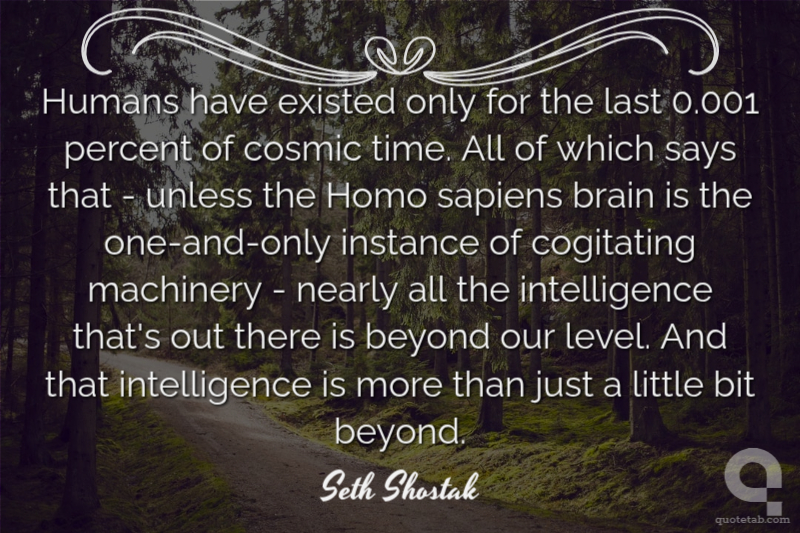 Humans have existed only for the last 0.001 percent of cosmic time. All of which says that - unless the Homo sapiens brain is the one-and-only instance of cogitating machinery - nearly all the intelligence that's out there is beyond our level. And that intelligence is more than just a little bit beyond.