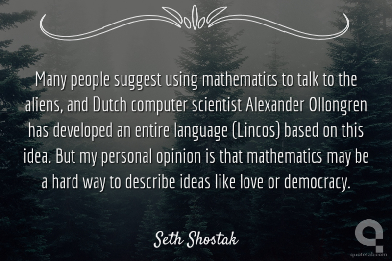 Many people suggest using mathematics to talk to the aliens, and Dutch computer scientist Alexander Ollongren has developed an entire language (Lincos) based on this idea. But my personal opinion is that mathematics may be a hard way to describe ideas like love or democracy.