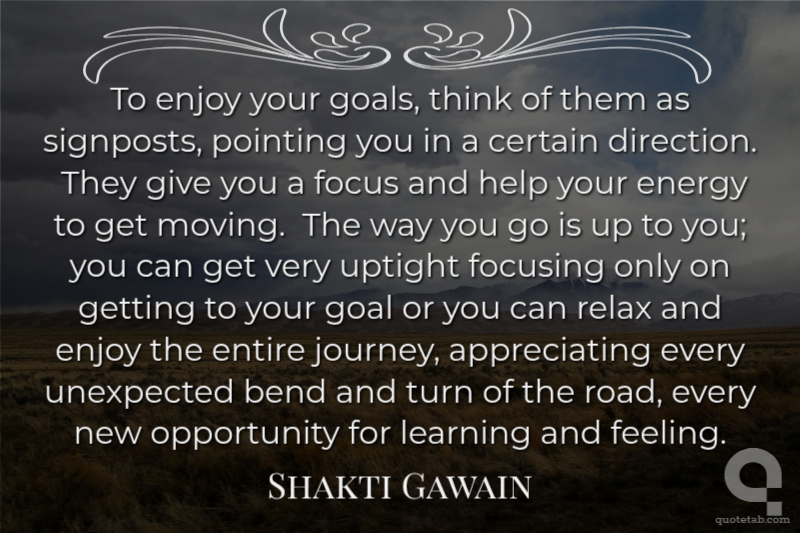 To enjoy your goals, think of them as signposts, pointing you in a certain direction. They give you a focus and help your energy to get moving. The way you go is up to you; you can get very uptight focusing only on getting to your goal or you can relax and enjoy the entire journey, appreciating every unexpected bend and turn of the road, every new opportunity for learning and feeling.