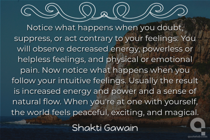 Notice what happens when you doubt, suppress, or act contrary to your feelings. You will observe decreased energy, powerless or helpless feelings, and physical or emotional pain. Now notice what happens when you follow your intuitive feelings. Usually the result is increased energy and power and a sense of natural flow. When you're at one with yourself, the world feels peaceful, exciting, and magical.