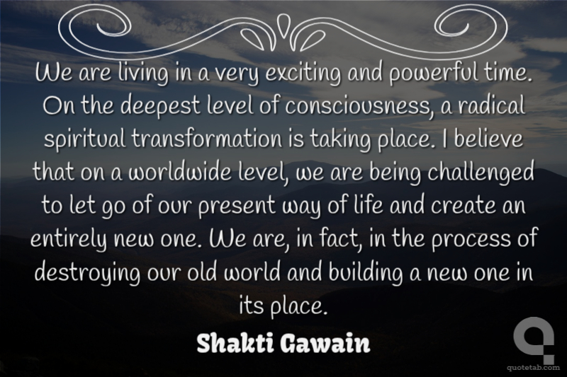 We are living in a very exciting and powerful time. On the deepest level of consciousness, a radical spiritual transformation is taking place. I believe that on a worldwide level, we are being challenged to let go of our present way of life and create an entirely new one. We are, in fact, in the process of destroying our old world and building a new one in its place.