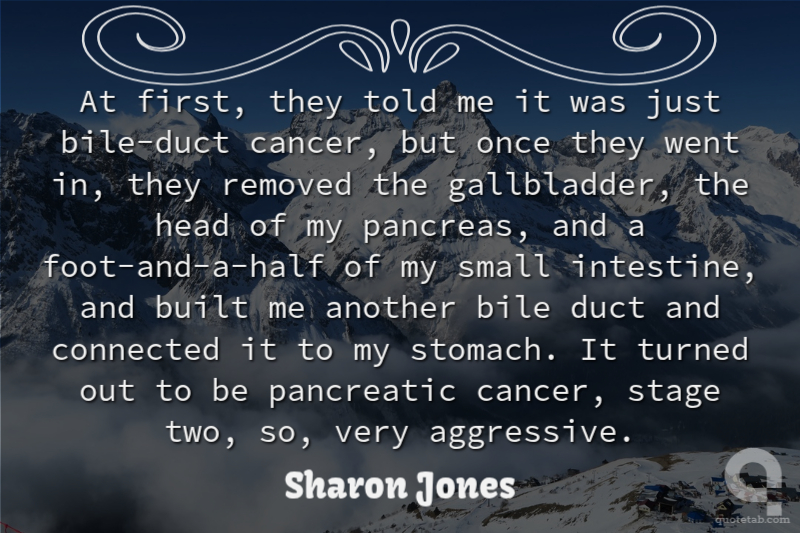 At first, they told me it was just bile-duct cancer, but once they went in, they removed the gallbladder, the head of my pancreas, and a foot-and-a-half of my small intestine, and built me another bile duct and connected it to my stomach. It turned out to be pancreatic cancer, stage two, so, very aggressive.