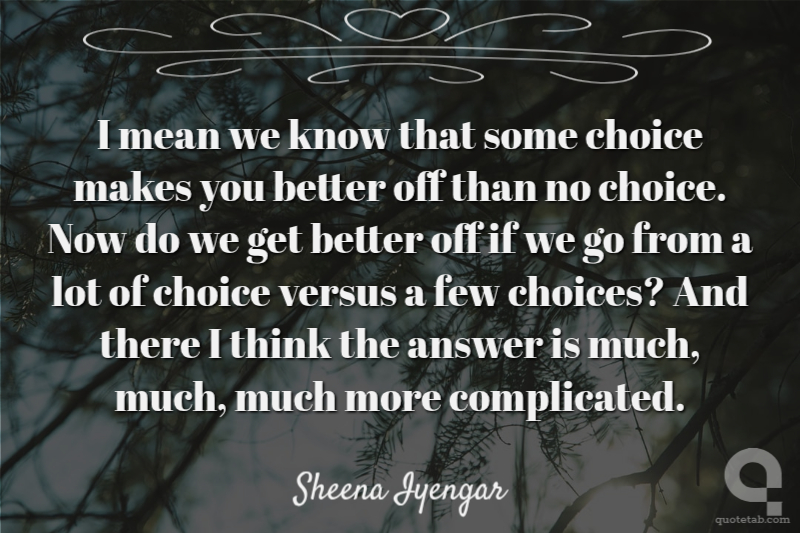 Sheena S. Iyengaris the inaugural S.T. Lee Professor of Business in the Management Division at Columbia Business School. She is one of the world's experts on choice. Her research focuses on: why people want choice, what affects how and what we choose, and how we can improve our decision-making outcomes...