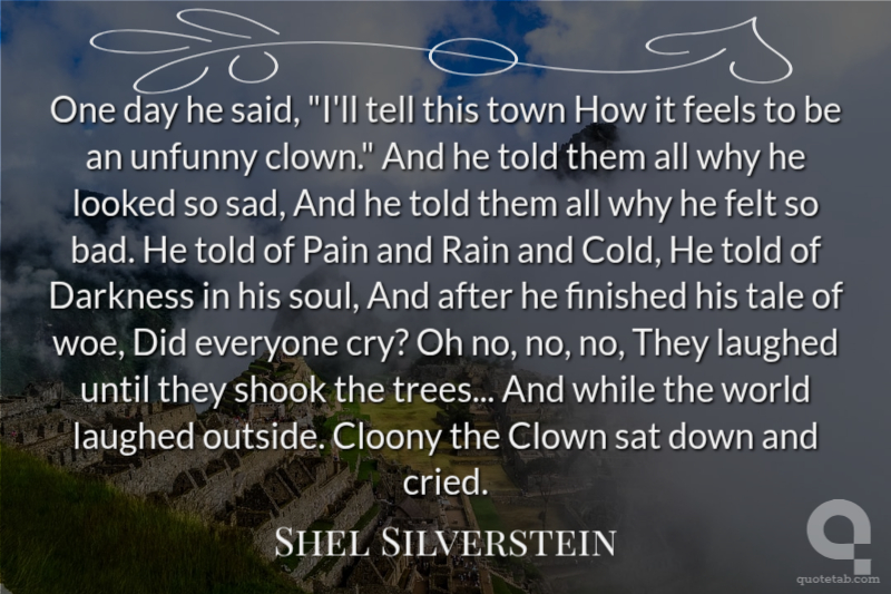 One day he said, "I'll tell this town How it feels to be an unfunny clown." And he told them all why he looked so sad, And he told them all why he felt so bad. He told of Pain and Rain and Cold, He told of Darkness in his soul, And after he finished his tale of woe, Did everyone cry? Oh no, no, no, They laughed until they shook the trees... And while the world laughed outside. Cloony the Clown sat down and cried.