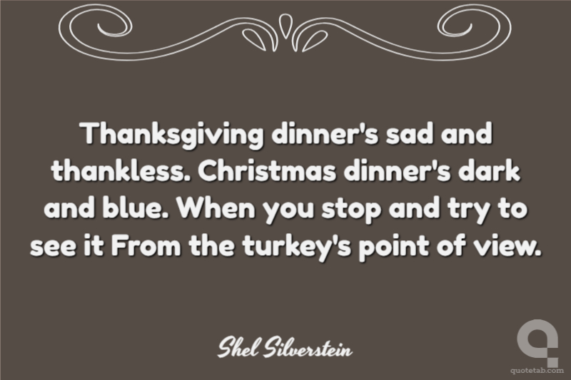 Thanksgiving dinner's sad and thankless. Christmas dinner's dark and blue. When you stop and try to see it From the turkey's point of view.
