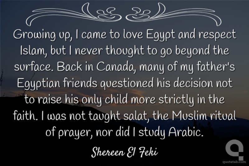Growing up, I came to love Egypt and respect Islam, but I never thought to go beyond the surface. Back in Canada, many of my father's Egyptian friends questioned his decision not to raise his only child more strictly in the faith. I was not taught salat, the Muslim ritual of prayer, nor did I study Arabic.