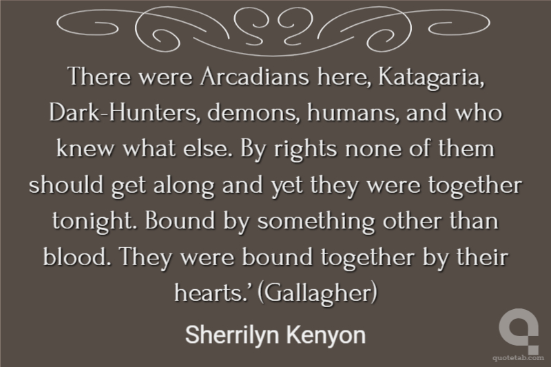 There were Arcadians here, Katagaria, Dark-Hunters, demons, humans, and who knew what else. By rights none of them should get along and yet they were together tonight. Bound by something other than blood. They were bound together by their hearts.’ (Gallagher)