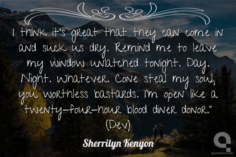 I think it's great that they can come in and suck us dry. Remind me to leave my window unlatched tonight. Day. Night. Whatever. Cone steal my soul, you worthless bastards. I'm open like a twenty-four-hour blood diner donor." (Dev)