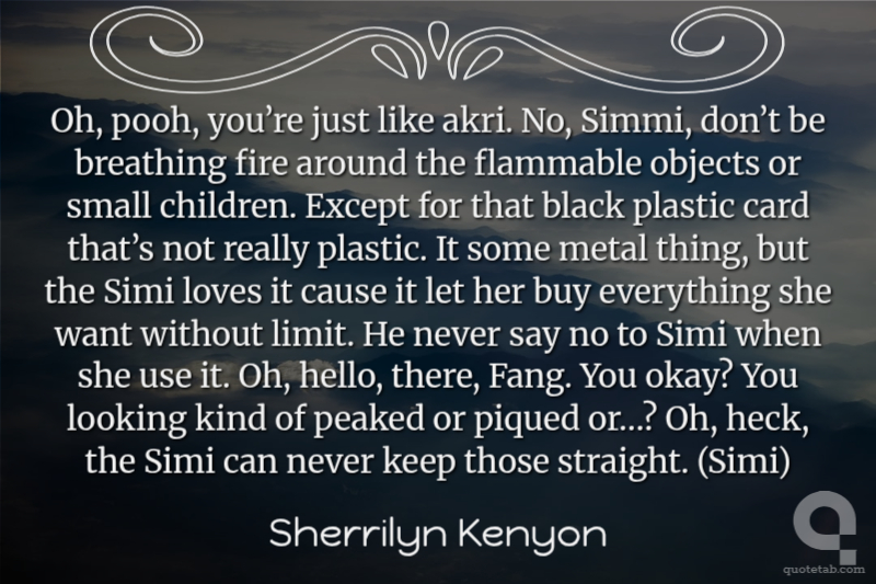Oh, pooh, you’re just like akri. No, Simmi, don’t be breathing fire around the flammable objects or small children. Except for that black plastic card that’s not really plastic. It some metal thing, but the Simi loves it cause it let her buy everything she want without limit. He never say no to Simi when she use it. Oh, hello, there, Fang. You okay? You looking kind of peaked or piqued or…? Oh, heck, the Simi can never keep those straight. (Simi)
