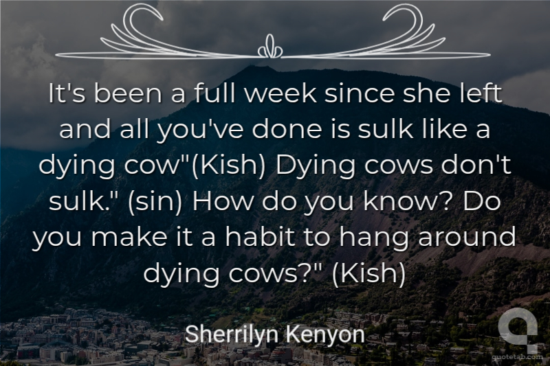 It's been a full week since she left and all you've done is sulk like a dying cow"(Kish) Dying cows don't sulk." (sin) How do you know? Do you make it a habit to hang around dying cows?" (Kish)