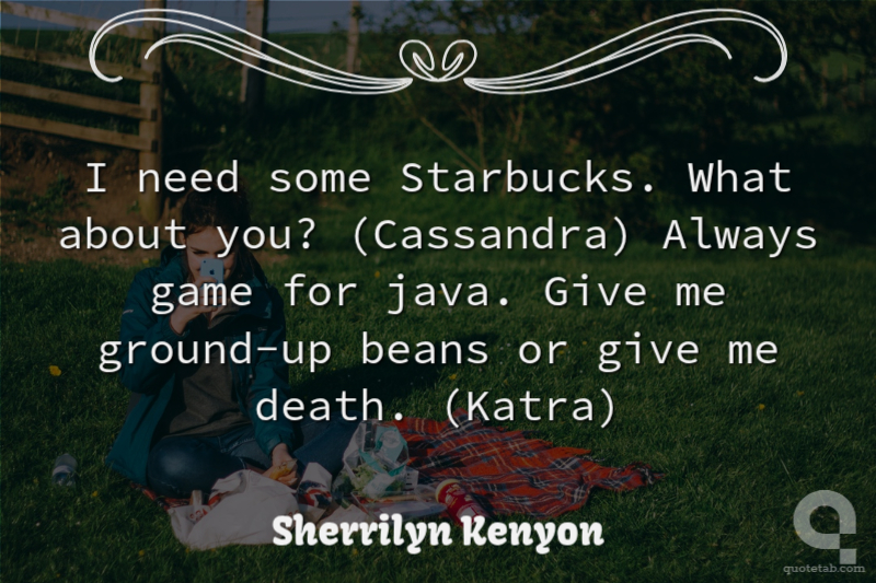 I need some Starbucks. What about you? (Cassandra) Always game for java. Give me ground-up beans or give me death. (Katra)
