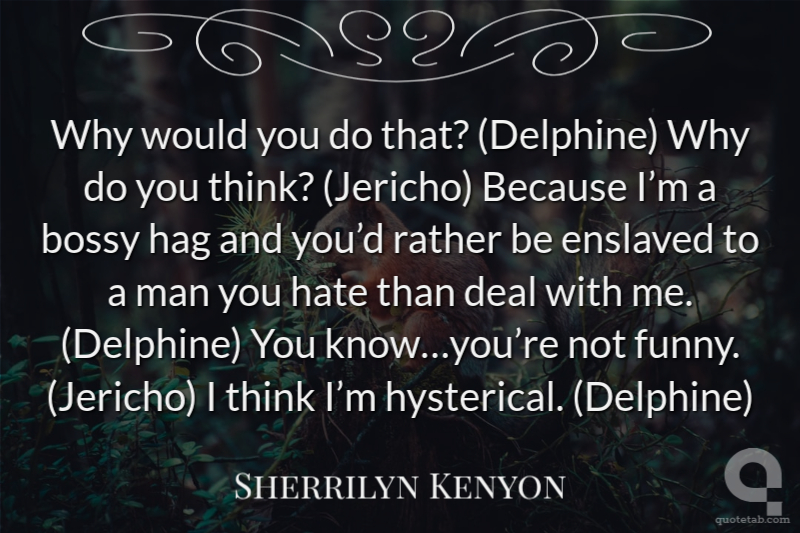 Why would you do that? (Delphine) Why do you think? (Jericho) Because I’m a bossy hag and you’d rather be enslaved to a man you hate than deal with me. (Delphine) You know…you’re not funny. (Jericho) I think I’m hysterical. (Delphine)