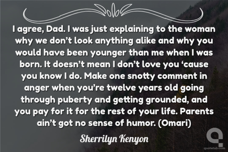 I agree, Dad. I was just explaining to the woman why we don’t look anything alike and why you would have been younger than me when I was born. It doesn’t mean I don’t love you ‘cause you know I do. Make one snotty comment in anger when you’re twelve years old going through puberty and getting grounded, and you pay for it for the rest of your life. Parents ain’t got no sense of humor. (Omari)