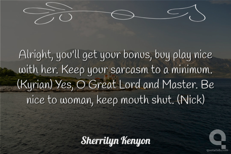 Alright, you'll get your bonus, buy play nice with her. Keep your sarcasm to a minimum. (Kyrian) Yes, O Great Lord and Master. Be nice to woman, keep mouth shut. (Nick)