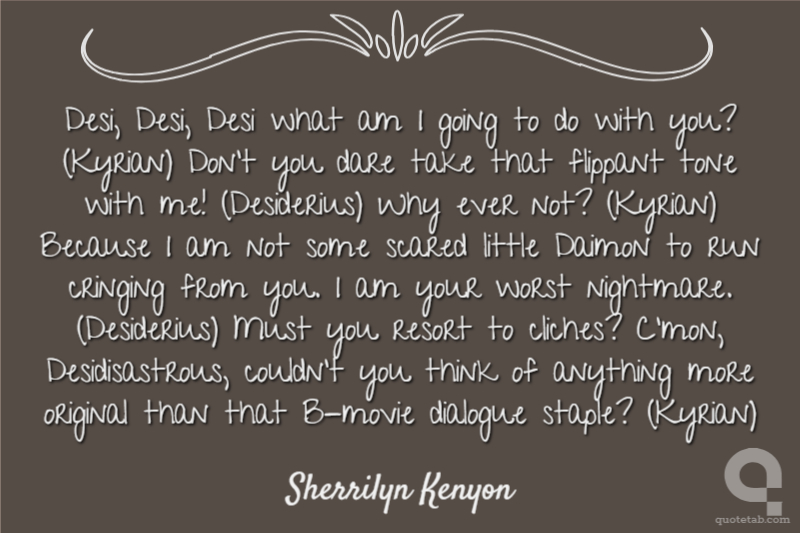 Desi, Desi, Desi what am I going to do with you? (Kyrian) Don't you dare take that flippant tone with me! (Desiderius) Why ever not? (Kyrian) Because I am not some scared little Daimon to run cringing from you. I am your worst nightmare. (Desiderius) Must you resort to cliches? C'mon, Desidisastrous, couldn't you think of anything more original than that B-movie dialogue staple? (Kyrian)
