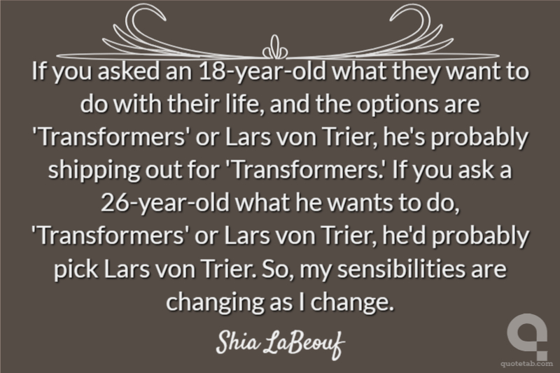If you asked an 18-year-old what they want to do with their life, and the options are 'Transformers' or Lars von Trier, he's probably shipping out for 'Transformers.' If you ask a 26-year-old what he wants to do, 'Transformers' or Lars von Trier, he'd probably pick Lars von Trier. So, my sensibilities are changing as I change.