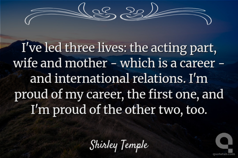 I've led three lives: the acting part, wife and mother - which is a career - and international relations. I'm proud of my career, the first one, and I'm proud of the other two, too.