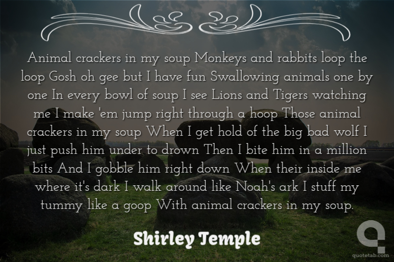 Animal crackers in my soup Monkeys and rabbits loop the loop Gosh oh gee but I have fun Swallowing animals one by one In every bowl of soup I see Lions and Tigers watching me I make 'em jump right through a hoop Those animal crackers in my soup When I get hold of the big bad wolf I just push him under to drown Then I bite him in a million bits And I gobble him right down When their inside me where it's dark I walk around like Noah's ark I stuff my tummy like a goop With animal crackers in my soup.