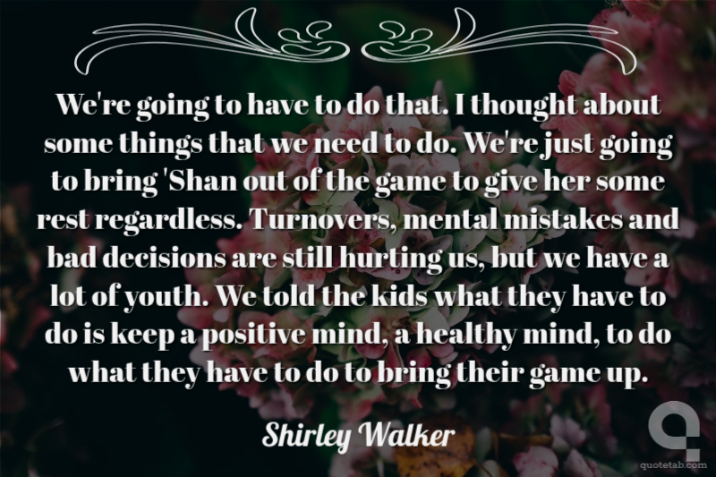 We're going to have to do that. I thought about some things that we need to do. We're just going to bring 'Shan out of the game to give her some rest regardless. Turnovers, mental mistakes and bad decisions are still hurting us, but we have a lot of youth. We told the kids what they have to do is keep a positive mind, a healthy mind, to do what they have to do to bring their game up.