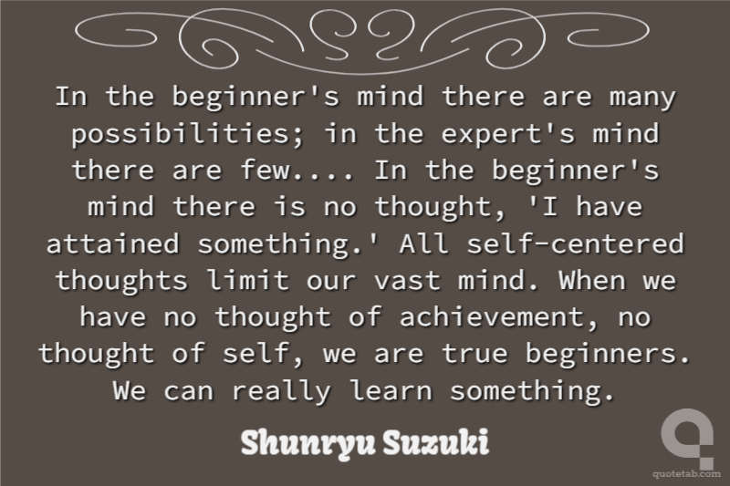 In the beginner's mind there are many possibilities; in the expert's mind there are few.... In the beginner's mind there is no thought, 'I have attained something.' All self-centered thoughts limit our vast mind. When we have no thought of achievement, no thought of self, we are true beginners. We can really learn something.