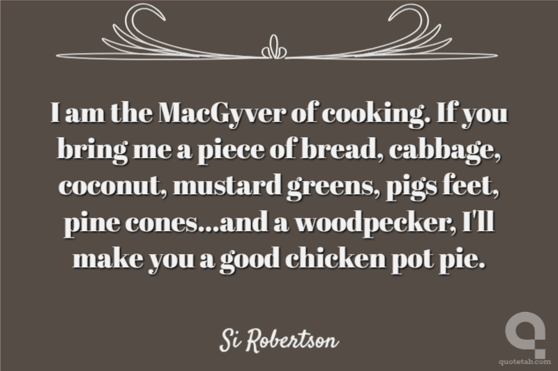 I am the MacGyver of cooking. If you bring me a piece of bread, cabbage, coconut, mustard greens, pigs feet, pine cones...and a woodpecker, I'll make you a good chicken pot pie.