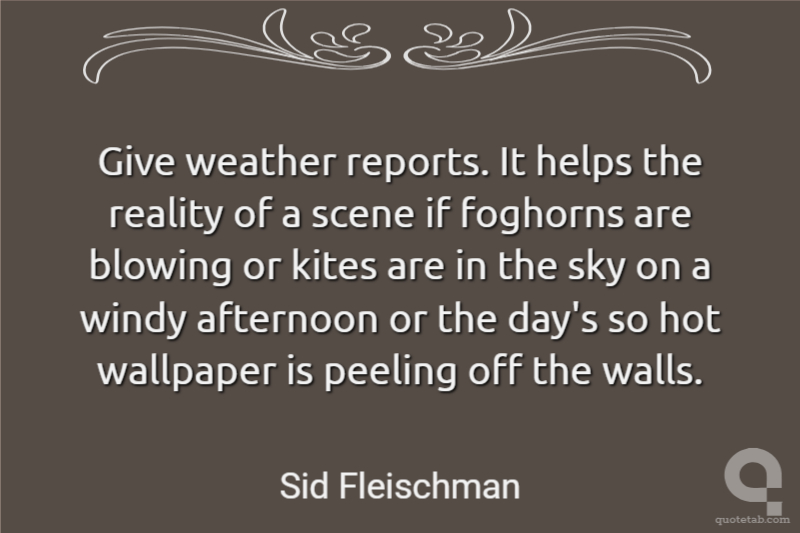 Give weather reports. It helps the reality of a scene if foghorns are blowing or kites are in the sky on a windy afternoon or the day's so hot wallpaper is peeling off the walls.