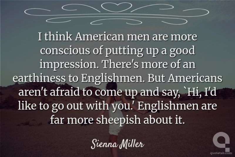 I think American men are more conscious of putting up a good impression. There's more of an earthiness to Englishmen. But Americans aren't afraid to come up and say, `Hi, I'd like to go out with you.' Englishmen are far more sheepish about it.